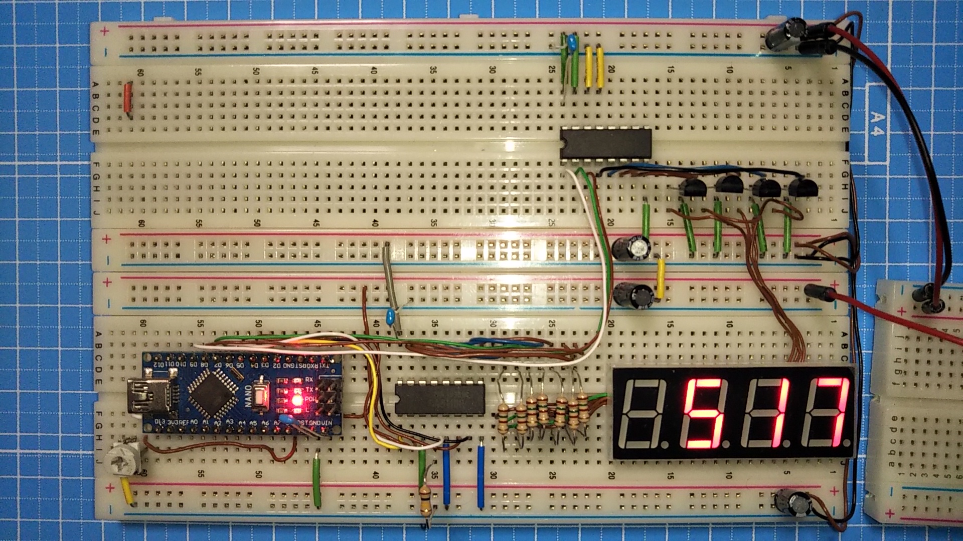 論理 IC で組んでいた 2 to 4 ラインデコーダを TC74HCT139 に置き換え、デジット制御回路を PNP 型トランジスタに変更しています。デジット制御回路から抵抗器がなくなっちゃいましたので、なんだかすっきりしましたねぇ。意外に良いのではないでしょうか (^_^;)
