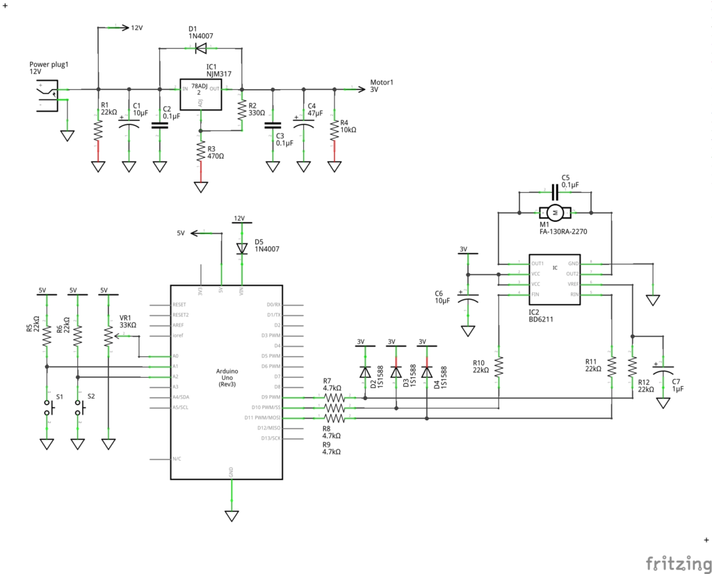 R7~R12 と D2~D4 は Arduino の出力 5V を、BD6211 の制御入力 3V に合わせるためのレベル変換回路です。Arduino の出力を BD6211 に直接つなぐと、壊れます。はい、壊しました (;´Д`)