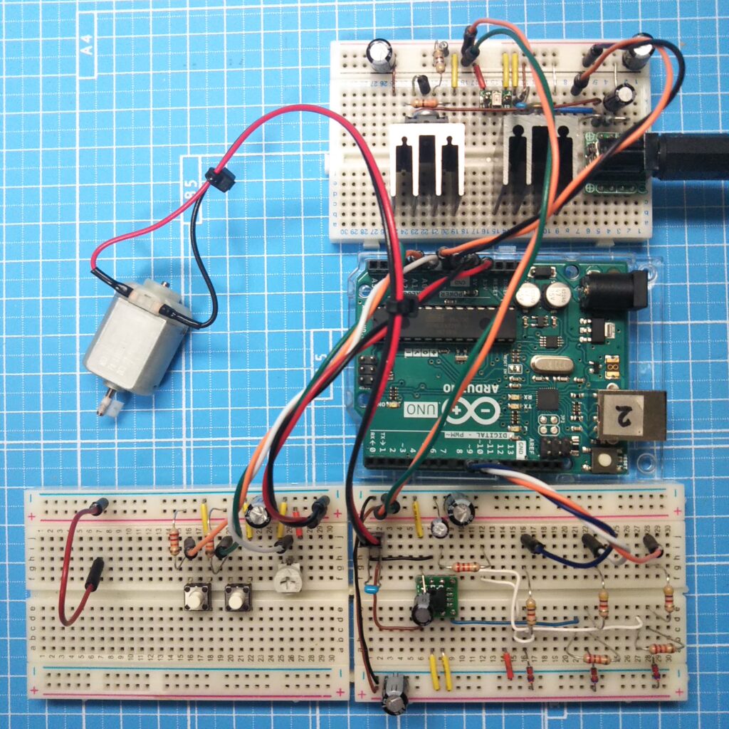 Arduino の左側は、正転・逆転の押しボタンスイッチと出力電圧調整用のボリュームです。押しボタンスイッチは、押しているあいだモータを回転させ、両方同時に押すとブレーキをかけます。
