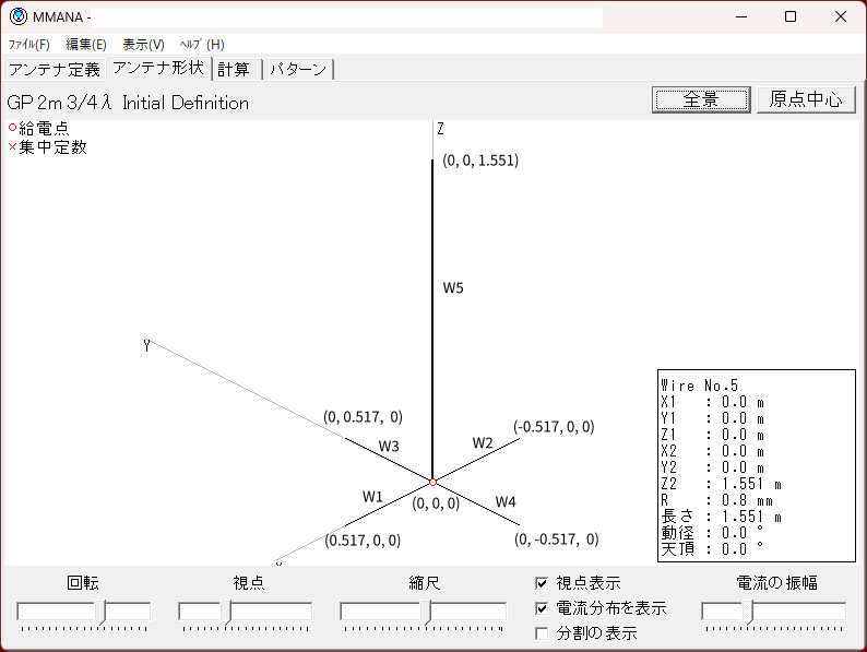 エレメントの長さを決めるために、今回は 3λ/4 というサイズの GP アンテナを考えてみました。